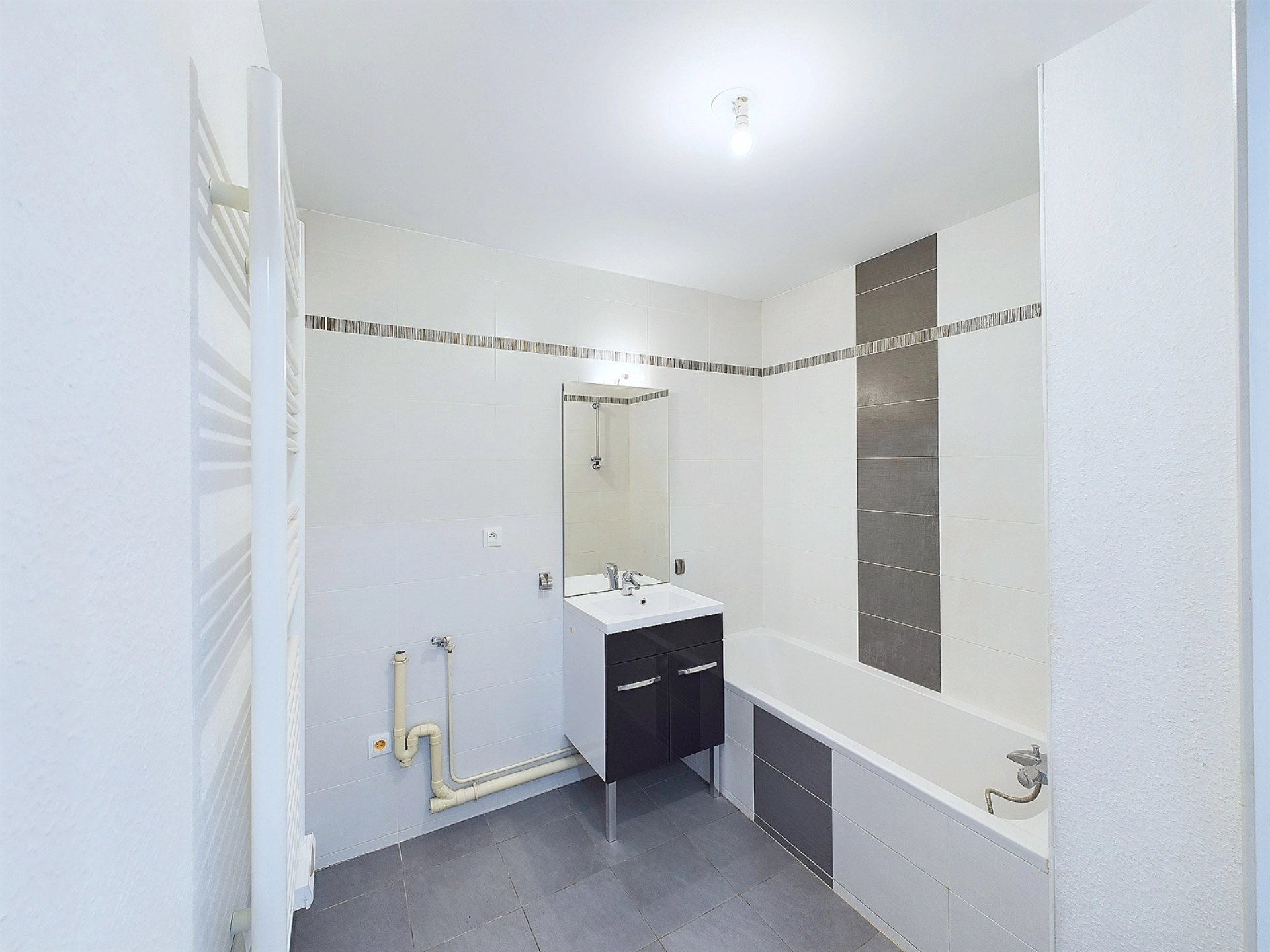Vous y trouverez aussi une belle salle de bain de 4,81m² entièrement équipée (baignoire-douche, sèche-serviette et attente lave-linge), ainsi qu'un WC séparé offrant une possibilité d’espace de rangement supplémentaire.