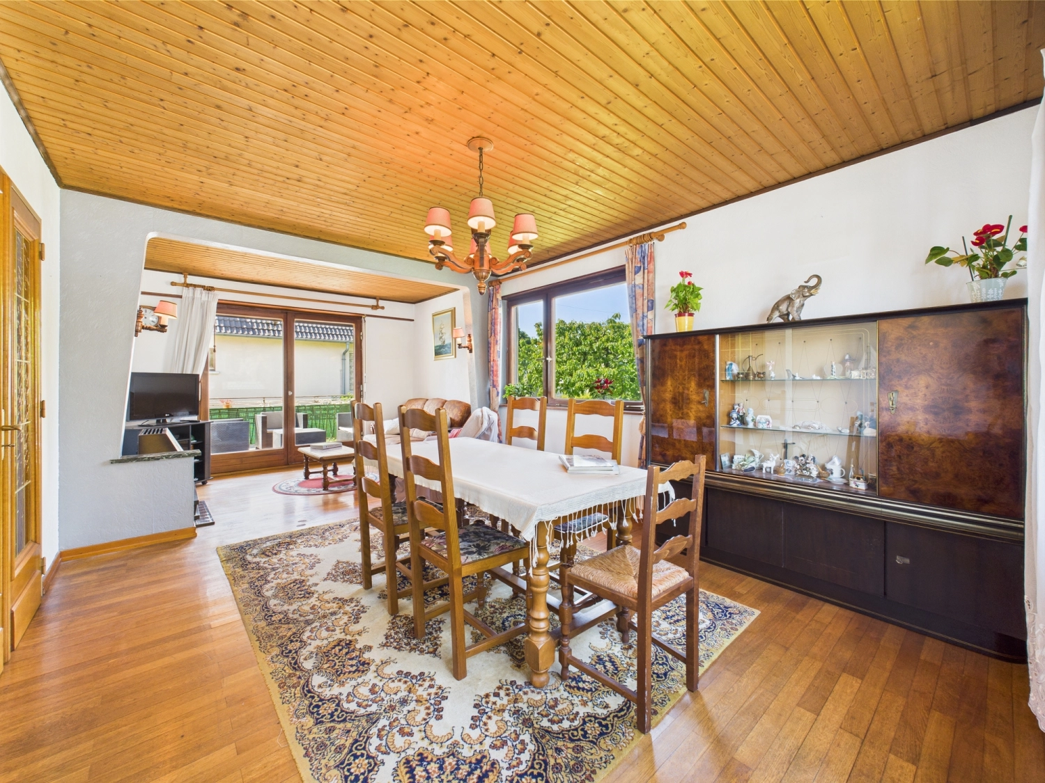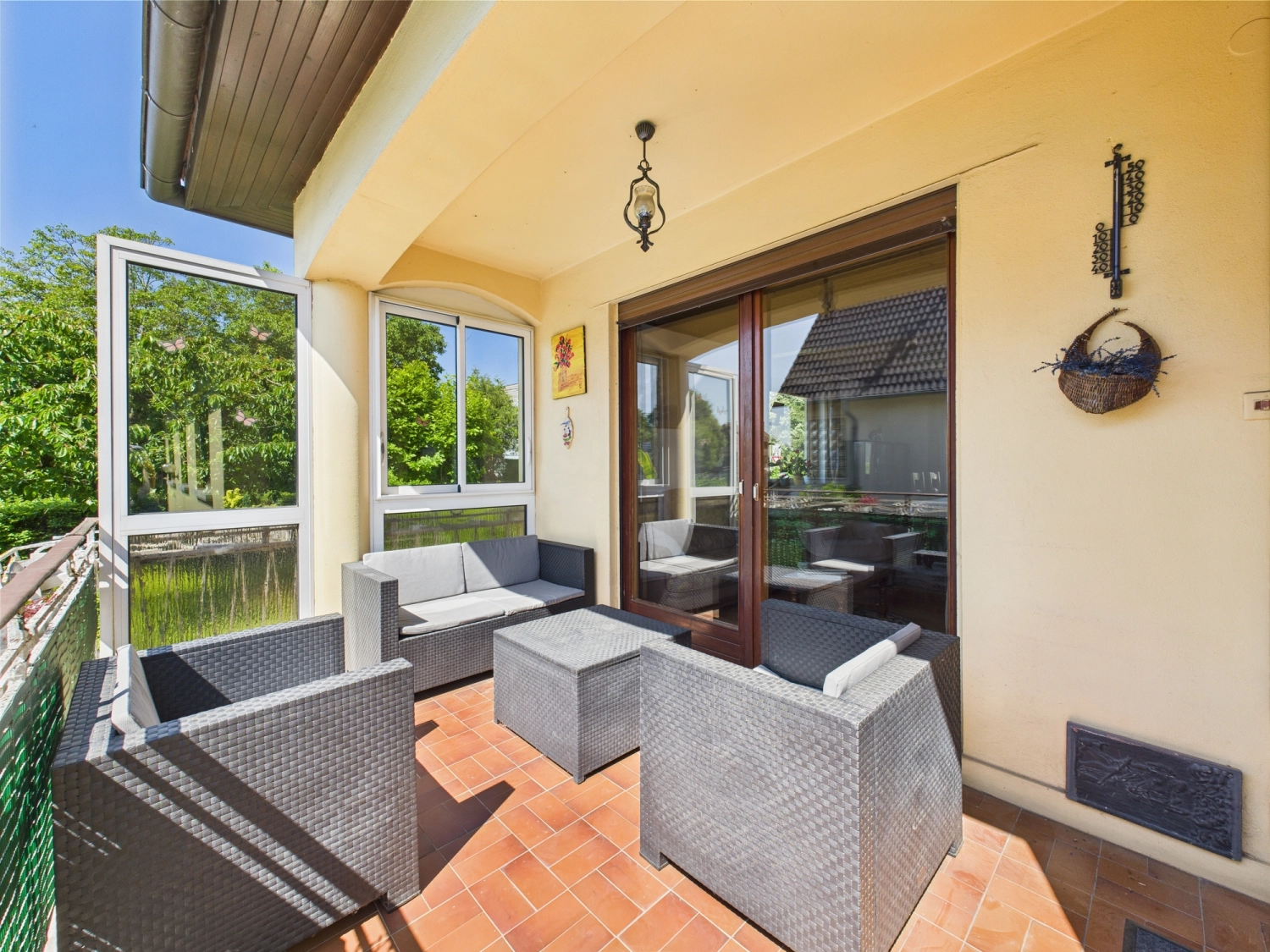 Après avoir franchi les quelques marches devant la porte principale, le hall d’entrée vous offre l’accès à une salle à manger d’environ 26 m2 bénéficiant d’un accès au balcon de 8,6 m2 via une porte-fenêtre.